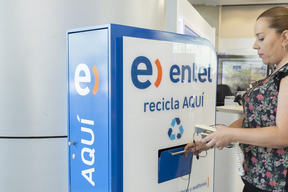 Desde 2014 Entel realiza múltiples iniciativas como el Reciclaje Electrónico en Tiendas, que consiste en buzones de reciclaje en las tiendas de la compañía, y el programa de Reciclaje Electrónico para Chile junto a Fundación Recyclápolis, con más de 644 contenedores en instituciones públicas y establecimientos educacionales. Estas acciones durante 2018 permitieron reciclar más de 12 toneladas de residuos electrónicos, evitando que lleguen a los vertederos.