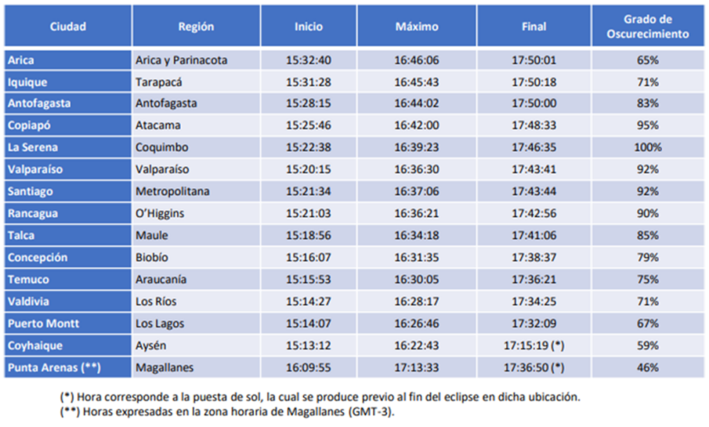 En el caso de Chile, se espera que el oscurecimiento sea de un 100% en el caso de la ciudad de La Serena, y de un 46% en Punta Arenas. En la Región Metropolitana el grado de oscurecimiento alcanzará un 92%.