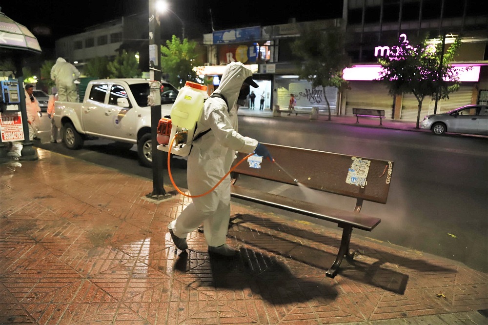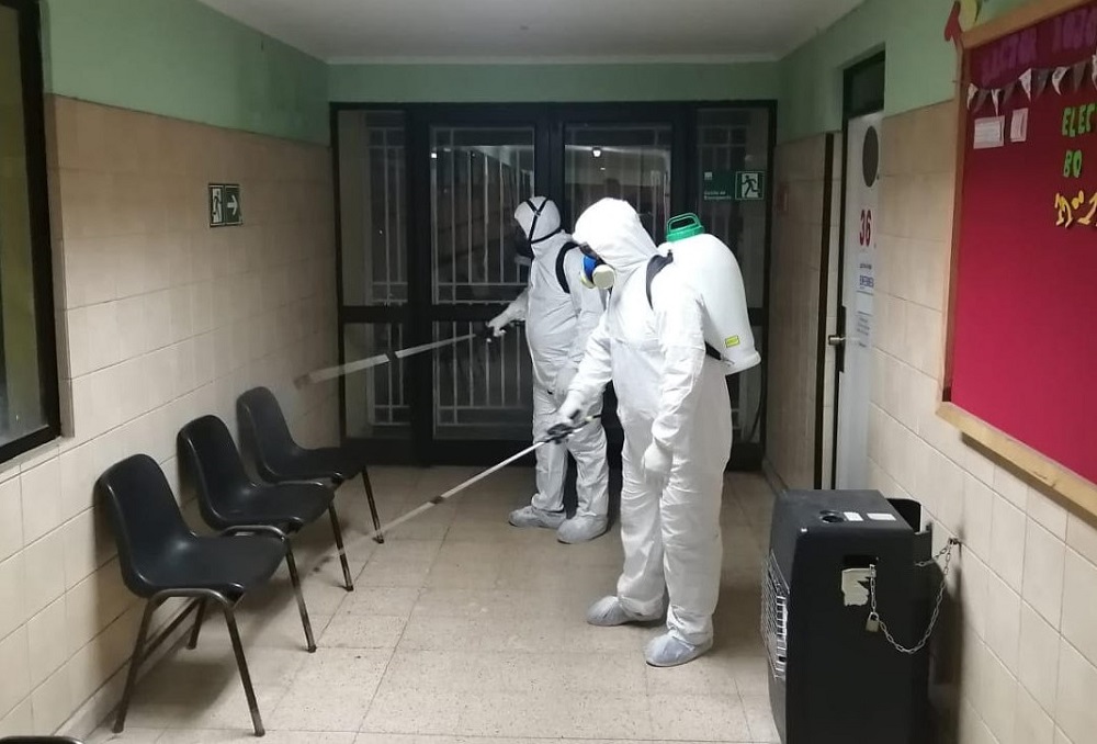 En una primera instancia, se comenzó con la desinfección de las principales calles y avenidas del centro de la comuna, como también veredas, paraderos de autobuses y colectivos, para finalizar con los Centros de Salud Familiar (CESFAM).