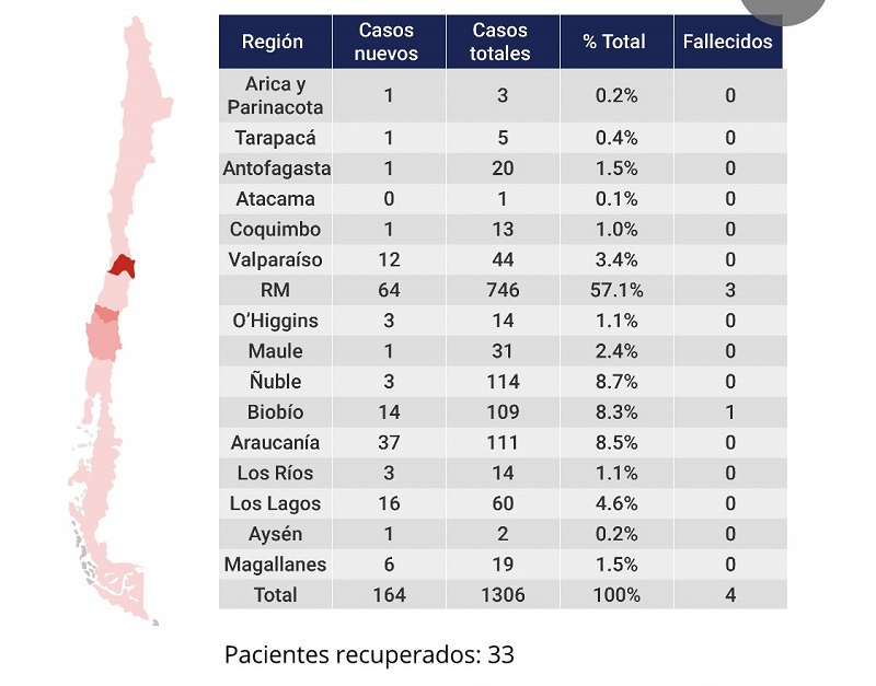El último balance realizado por el Ministerio de Salud realizado este jueves indica que los casos confirmados de coronavirus en el país han aumentado a 1.306, de los cuales 164 fueron reportados en las últimas 24 horas. El titular de la cartera, Jaime Mañalich, indicó además que se suma un cuarto fallecimiento por COVID-19 en el país: un paciente de 80 años que falleció en un recinto hospitalario de la Región del Biobío.