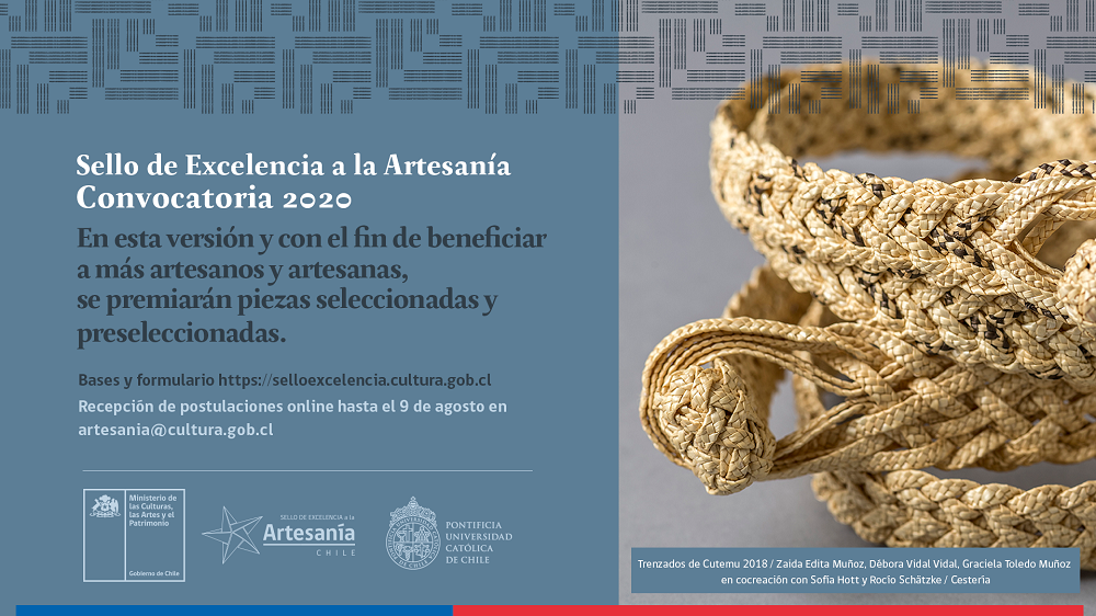 Como parte de las acciones enfocadas a identificar y posicionar el sector artesanal en los territorios que comprenden Chile, el Comité Nacional de Artesanía -integrado por el Ministerio de las Culturas, las Artes y el Patrimonio, a través de su área de Artesanía y la Escuela de Diseño de la Pontificia Universidad Católica de Chile, a través de su Programa de Artesanía, con el patrocinio de la Oficina Unesco de Santiago-, invita a creadores del país a postular al Sello de Excelencia a la Artesanía de Chile 2020.