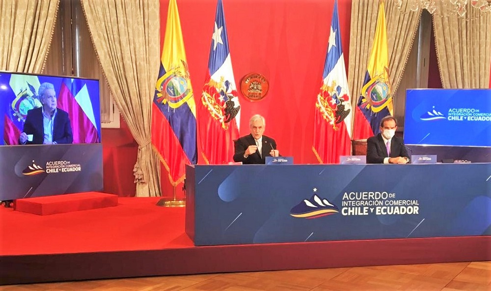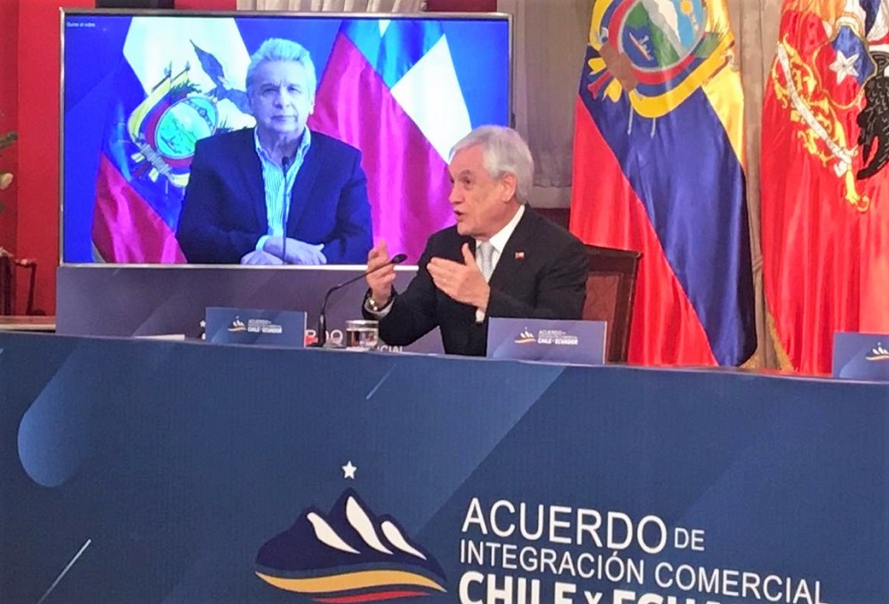 El Presidente Sebastián Piñera acompañado del Ministro de Relaciones Exteriores, Andrés Allamand, firmó un nuevo Acuerdo de Integración Económica con Ecuador. La firma fue realizada de manera telemática y simultánea con el jefe de Estado ecuatoriano, Lenín Moreno; y su ministro de Producción, Comercio Exterior, Inversiones y Pesca, Iván Ontaneda, quienes estuvieron en la ciudad de Quito.