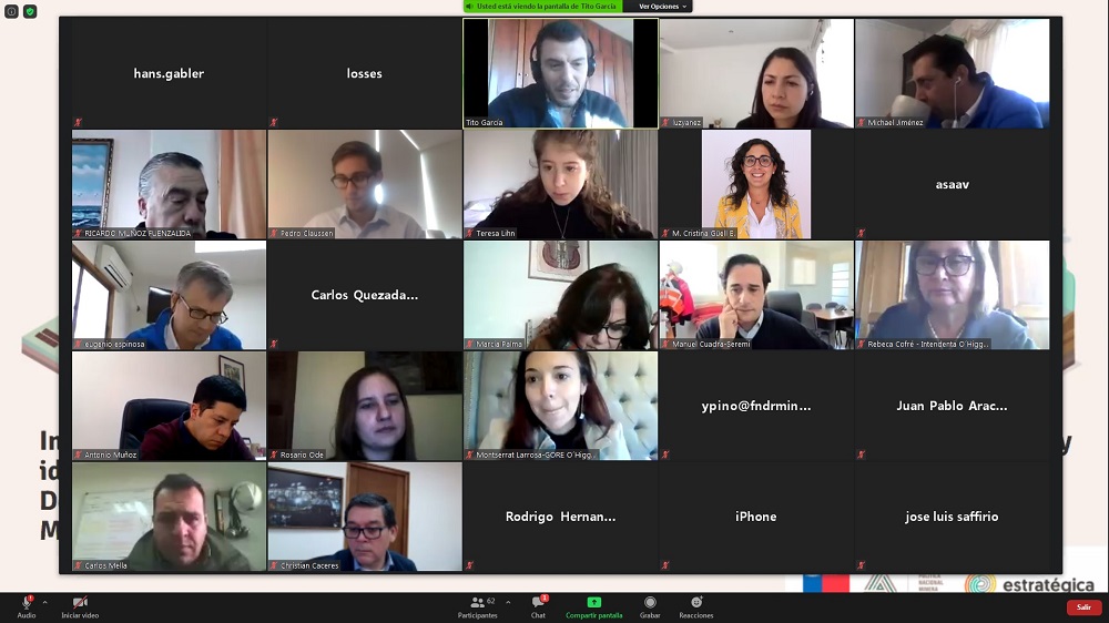 En la Región de O’Higgins los asistentes (en modalidad virtual) se agruparon en cinco mesas de trabajo, cada una de las cuales entregó propuestas frente a los desafíos levantados. Así, un grupo propuso potenciar la innovación tecnológica en toda la cadena de valor para aumentar la competitividad y sostenibilidad del negocio; el segundo acordó priorizar una institucionalidad para el desarrollo de capital humano en minería, considerando la incorporación de más mujeres y la formación de profesionales a través de un trabajo conjunto; el tercero planteó la necesidad de fomentar la gestión sustentable de los pasivos ambientales mineros en base a información actualizada que permita un manejo de riesgos; el cuarto enfatizó en incorporar innovación y tecnología en la pequeña minería y la minería artesanal, además de contar con un poder de compra eficiente en la región; y el quinto grupo apuntó a compatibilizar un capital humano feliz en el trabajo con mayor productividad.