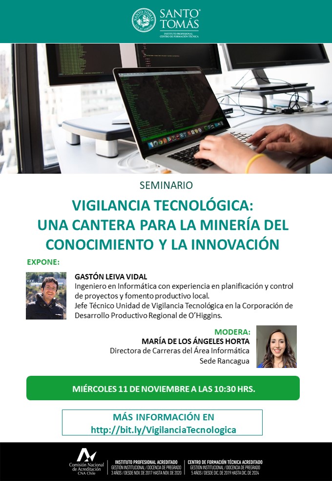 Para más información e inscripciones al seminario “Vigilancia Tecnológica: Una cantera para la minería del conocimiento y la innovación”, puedes visitar o las redes sociales de Santo Tomás Rancagua en Instagram, Facebook y Twitter.