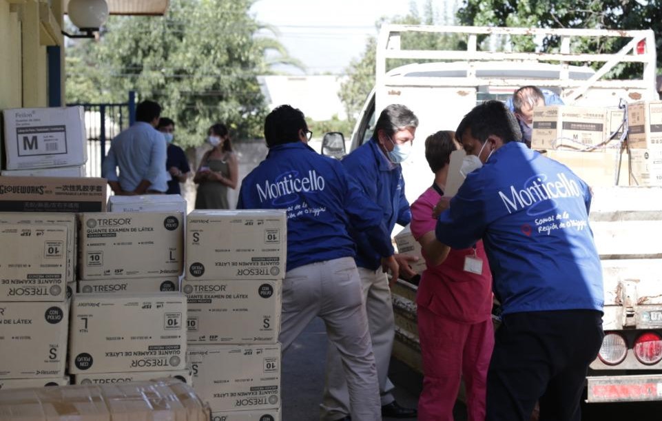 Representantes de Monticello hicieron entrega de insumos médicos por $11 millones a la Directora del Cesfam del municipio de Mostazal, Claudia Real. La entrega de esos productos correspondió a Elementos de Protección Personal (EPP) – tales como guantes quirúrgicos, mascarillas, pecheras impermeables, cubre calzado y alcohol gel (70%) – a objeto que el municipio siga cumpliendo con los estándares en la entrega de sus servicios de salud.