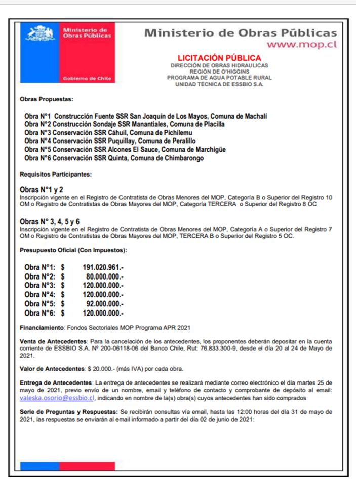 LEGALES LICITACIÓN PÚBLICA mayo 19, 2021 1028 Cuota FacebookTwitterWhatsAppImpresión DIRECCIÓN DE OBRAS HIDRÁULICAS – REGIÓN DE O’HIGGINS PROGRAMA DE AGUA POTABLE RURAL – UNIDAD TÉCNICA DE ESSBIO S.A.