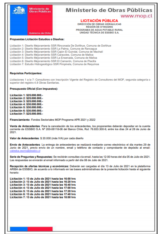EMPRESASLEGALES LICITACIÓN PÚBICA junio 23, 2021 1368 Cuota FacebookTwitterWhatsAppImpresión DIRECCIÓN DE OBRAS HIDRÁULICAS REGIÓN DE O’HIGGINS PROGRAMA DE AGUA POTABLE RURAL UNIDAD TÉCNICA DE ESSBIO S.A.