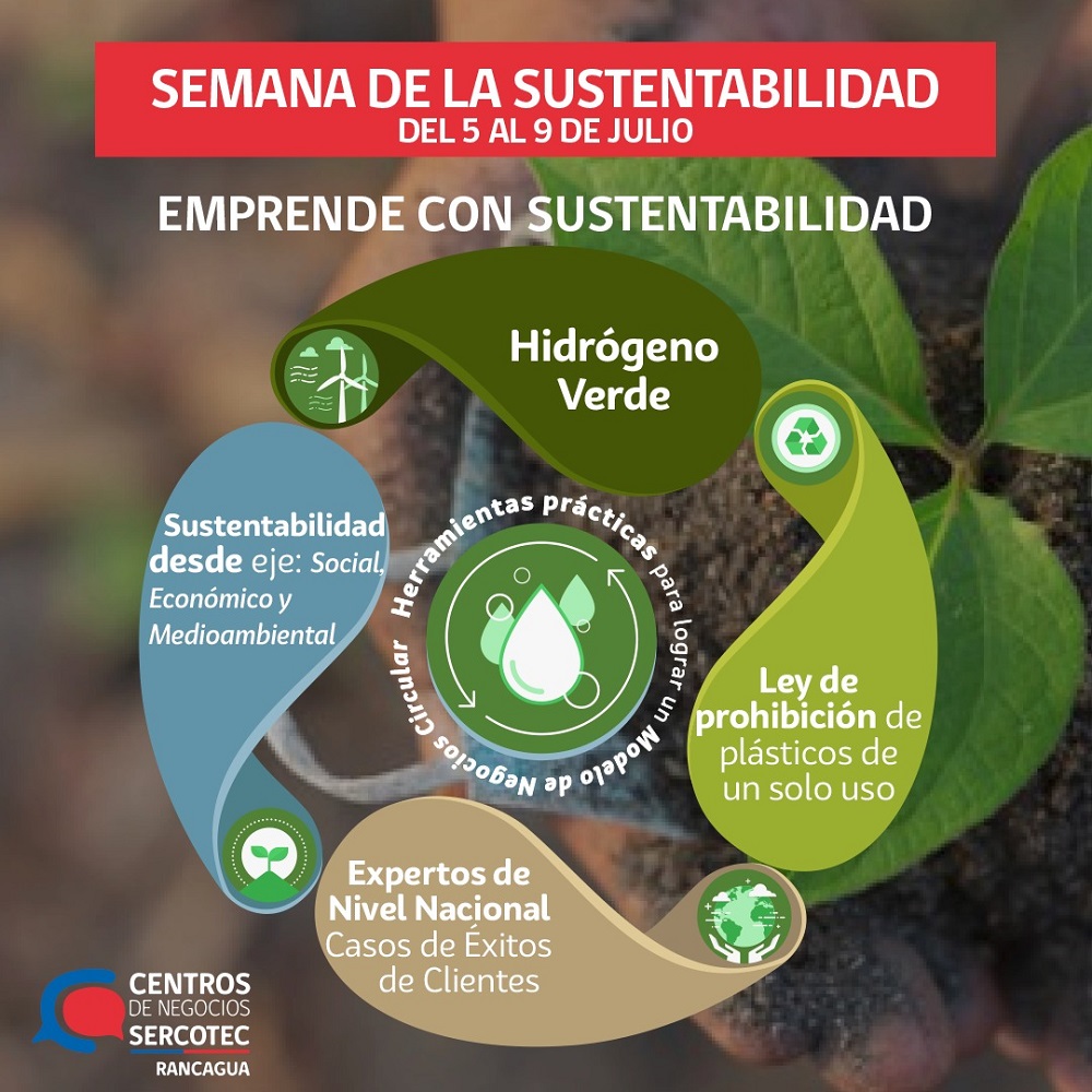 Entre el lunes 5 y viernes 9 de julio, la Región de O’Higgins será el epicentro de los negocios sostenibles. Durante los 5 días se realizará la Semana de la Sustentabilidad, organizada por el Centro de Negocios Sercotec Rancagua, evento que cuenta con una nutrida agenda de exposiciones online de profesionales y expertos con estudios nacionales e internacionales, quienes abordarán entre otras temáticas Energías Renovables No Convencionales, Reciclaje, Hidrógeno Verde, Economía Circular, la reciente Ley sobre prohibición de plásticos de un solo uso, agricultura 4.0, Sustentabilidad y Comercio Justo, evidencias sobre la oportunidad económica de hacer negocios sostenibles, entre otros.