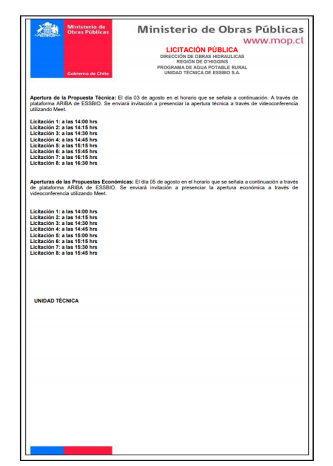 InicioEMPRESASLICITACIÓN PÚBLICA EMPRESASLEGALES LICITACIÓN PÚBLICA julio 13, 2021 0 1650 DIRECCIÓN DE OBRAS HIDRÁULICAS REGIÓN DE O’HIGGINS PROGRAMA DE AGUA POTABLE RURAL UNIDAD TÉCNICA DE ESSBIO S.A. FacebookTwitterWhatsAppImpresión Artículo anteriorEntregan nueva implementación para el desarrollo del surf y esgrima regionalArtículo siguienteEste miércoles asume Pablo Silva como el primer Gobernador Regional, Ricardo Guzmán es el nuevo Delegado Presidencial Cristian Ibarrahttps://www.diarioelpulso.cl RELATED ARTICLES EMPRESAS Inéditas críticas de biministro Mas a Codelco tensionan junta de accionistas de la estatal abril 17, 2026 ECONOMÍA Empresa da a conocer alternativas para ahorrar hasta $7.500 en la compra de gas cilindro en la Región de O’Higgins abril 16, 2026 CIENCIA Y TECNOLOGÍA Según la Subtel, Chile tiene el internet fijo más barato de Latinoamérica abril 15, 2026 Archivos abril 2026 marzo 2026 febrero 2026 enero 2026 diciembre 2025 noviembre 2025 octubre 2025 septiembre 2025 agosto 2025 julio 2025 junio 2025 mayo 2025