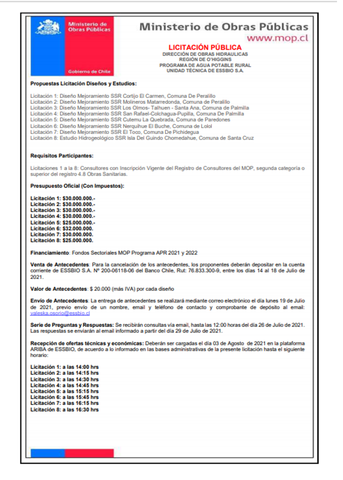 InicioEMPRESASLICITACIÓN PÚBLICA EMPRESASLEGALES LICITACIÓN PÚBLICA julio 13, 2021 0 1648 DIRECCIÓN DE OBRAS HIDRÁULICAS REGIÓN DE O’HIGGINS PROGRAMA DE AGUA POTABLE RURAL UNIDAD TÉCNICA DE ESSBIO S.A. FacebookTwitterWhatsAppImpresión Artículo anteriorEntregan nueva implementación para el desarrollo del surf y esgrima regionalArtículo siguienteEste miércoles asume Pablo Silva como el primer Gobernador Regional, Ricardo Guzmán es el nuevo Delegado Presidencial Cristian Ibarrahttps://www.diarioelpulso.cl RELATED ARTICLES EMPRESAS Inéditas críticas de biministro Mas a Codelco tensionan junta de accionistas de la estatal abril 17, 2026 ECONOMÍA Empresa da a conocer alternativas para ahorrar hasta $7.500 en la compra de gas cilindro en la Región de O’Higgins abril 16, 2026 CIENCIA Y TECNOLOGÍA Según la Subtel, Chile tiene el internet fijo más barato de Latinoamérica abril 15, 2026 Archivos abril 2026 marzo 2026 febrero 2026 enero 2026 diciembre 2025 noviembre 2025 octubre 2025 septiembre 2025 agosto 2025 julio 2025 junio 2025 mayo 2025