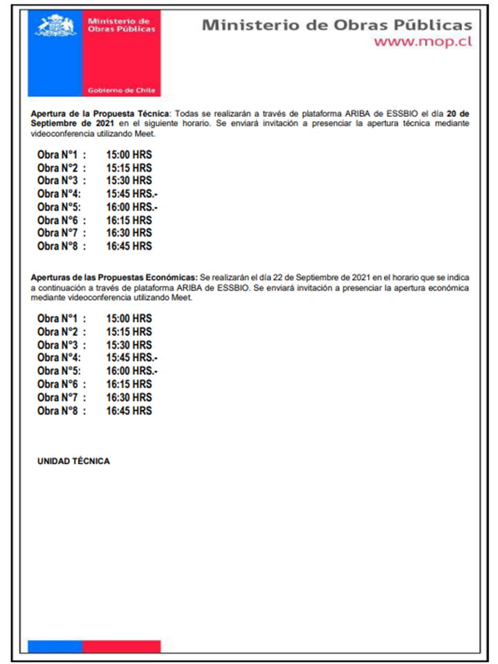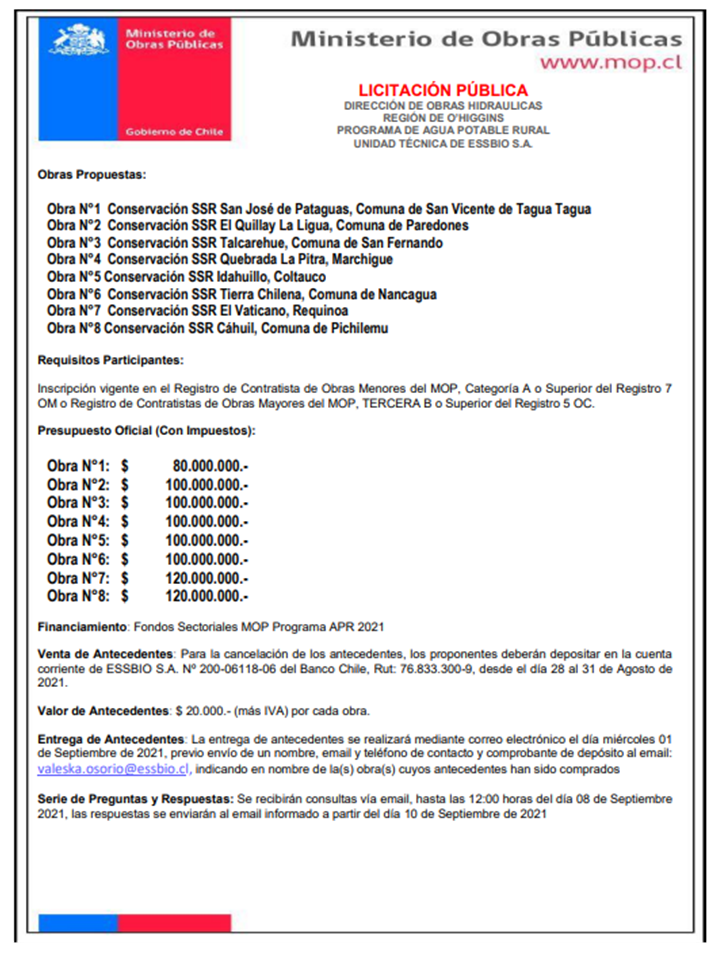 EMPRESASLEGALES LICITACIÓN DE OBRAS PÚBLICAS agosto 27, 2021 1752 Cuota FacebookTwitterWhatsAppImpresión DIRECCIÓN DE OBRAS HIDRÁULICAS REGIÓN DE O’HIGGINS PROGRAMA DE AGUA POTABLE RURAL UNIDAD TÉCNICA DE ESSBIO S.A.
