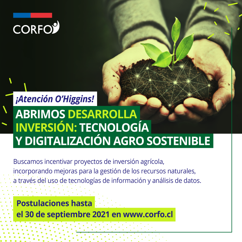 Hasta el jueves 30 de septiembre se extiende el plazo de postulación para el programa “Desarrolla Inversión: Tecnología y Digitalización Agro Sostenible”, iniciativa liderada por Corfo, cuyo foco principal es cofinanciar proyectos que incorporen tecnología avanzada para el sector agrícola en la región de O’Higgins.