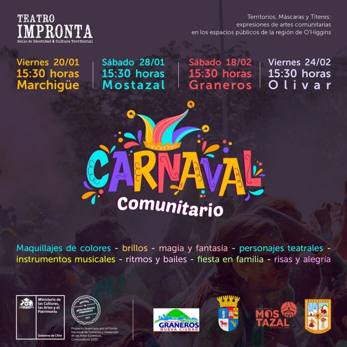 Entre los meses de enero y febrero, durante el verano de 2023, se llevará a cabo la itinerancia de obras teatrales, carnavales comunitarios y laboratorios de co-creación de personajes de murga organizado por Teatro Impronta, compañía teatral proveniente de Rancagua que cumple 10 años de trayectoria en el ámbito de la gestión cultural y comunitaria. La iniciativa recorrerá las comunas de Marchigüe, Mostazal, Graneros y Olivar con programación gratuita y apta para todo público.