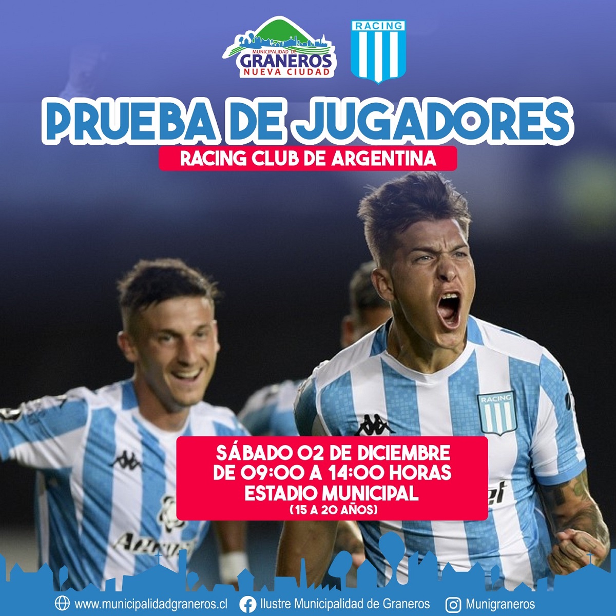 Este sábado 2 de diciembre Racing Club de Avellaneda, uno de los 5 “grandes” del fútbol argentino realizará una prueba masiva de jugadores en Graneros. El “Scouting Internacional”, se realizará entre las 09:00 y 14:00 horas en el estadio Municipal de la comuna.