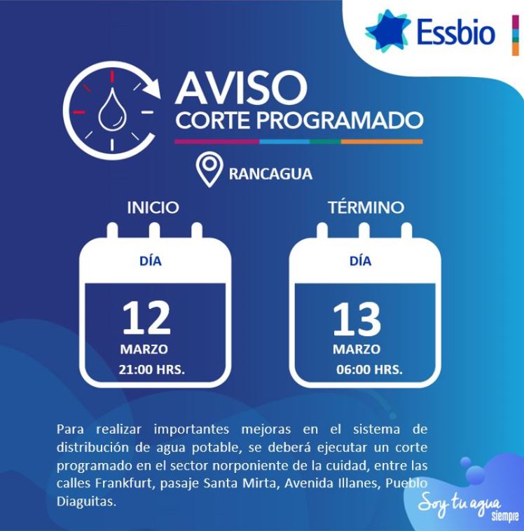 Para realizar importantes mejoras en el sistema de distribución de agua potable, se deberá ejecutar un corte de servicio en el sector norponiente de la ciudad, entre las calles Frankfurt, pasaje Santa Mirta, Avenida Illanes, Pueblo Diaguitas.