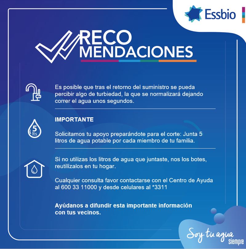Tras el retorno del suministro, se podría percibir algo de turbiedad, la que se normalizará dejando correr el agua unos segundos. cualquier consulta, se agradece a la comunidad contactarse con el Centro de Ayuda 600 3311000 y 1.