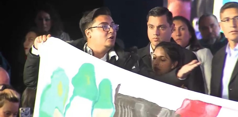 El manifestante, ante el público presente, señaló que “Carabineros de Chile no actuó, el Ministerio de Interior, que es parte de la querella, no ha solicitado ninguna diligencia en la investigación, para encontrar justicia para nuestra compañera periodista asesinada… y nos están hablando de libertad de expresión y libertad de prensa el día de hoy. Es una burla, señor presidente”.