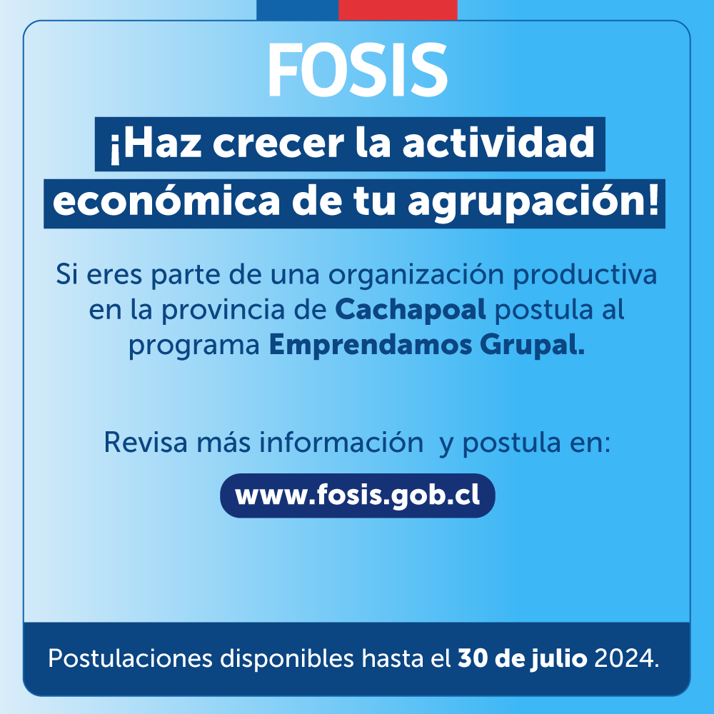 El Fondo de Solidaridad e Inversión Social de la Región de O’Higgins, FOSIS, está convocando a agrupaciones de carácter productivo y a cooperativas a participar en el programa Emprendamos Grupal Autogestionado, proyecto que financiará iniciativas para hacer crecer los negocios de organizaciones de la provincia de Cachapoal.