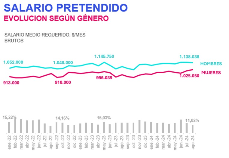 Al observar la pretensión salarial por género, la investigación da cuenta de que la brecha baja respecto del mes anterior, pasando de 13,68% a 11,02%. Así, el salario promedio requerido por los hombres es de $1.138.038 por mes, mientras que el de las mujeres es de$1.025.050. En el período, el salario medio requerido por los hombres baja 0,68%, mientras que el de las mujeres sube 1,70%.