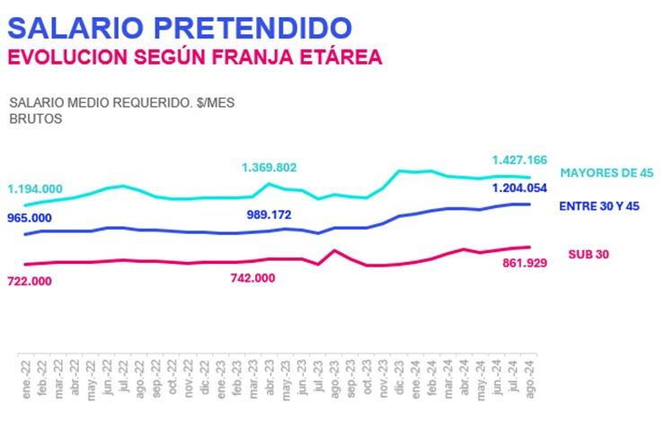En agosto de este año, el salario pretendido por las personas postulantes mayores de 45 años llegó a $1.427.166; entre 30 y 45 años a $1.204.054 y para los menores de 30 años anotó $861.929