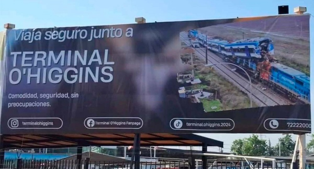 El cartel indica “Viaja seguro junto a Terminal O’Higgins. Comodidad, seguridad, sin preocupaciones”, acompañado de una fotografía que muestra un accidente ocurrido el pasado 20 de junio en San Bernardo, donde dos trenes, uno de Fepasa, y otro de pasajeros en prueba, colisionaron de forma frontal, resultando en la muerte de dos personas.