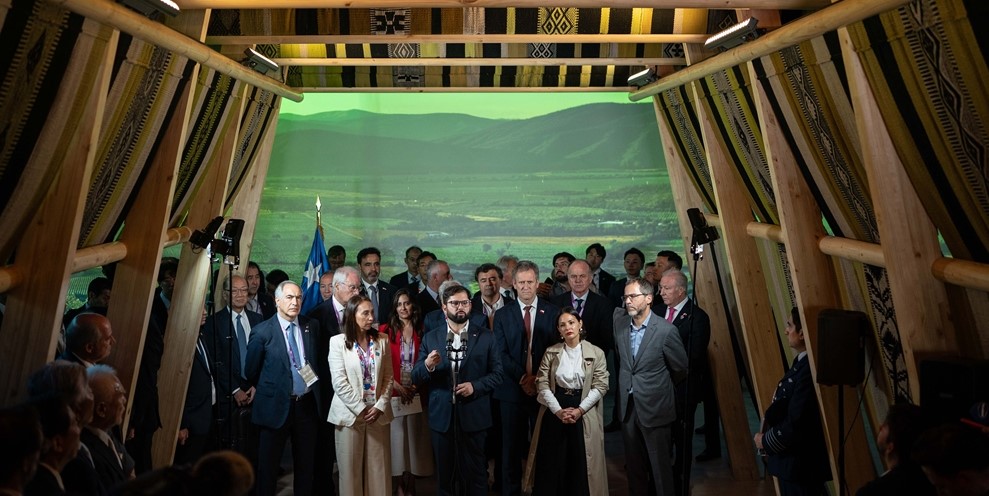 El mandatario, junto a diversas autoridades y miembros de la comitiva oficial, asistió a la propuesta denominada “MAKÜN: El Manto de Chile”, que simboliza aspectos como la geografía de nuestro país, su creatividad y su búsqueda de liderazgo en diversas materias clave para el planeta.