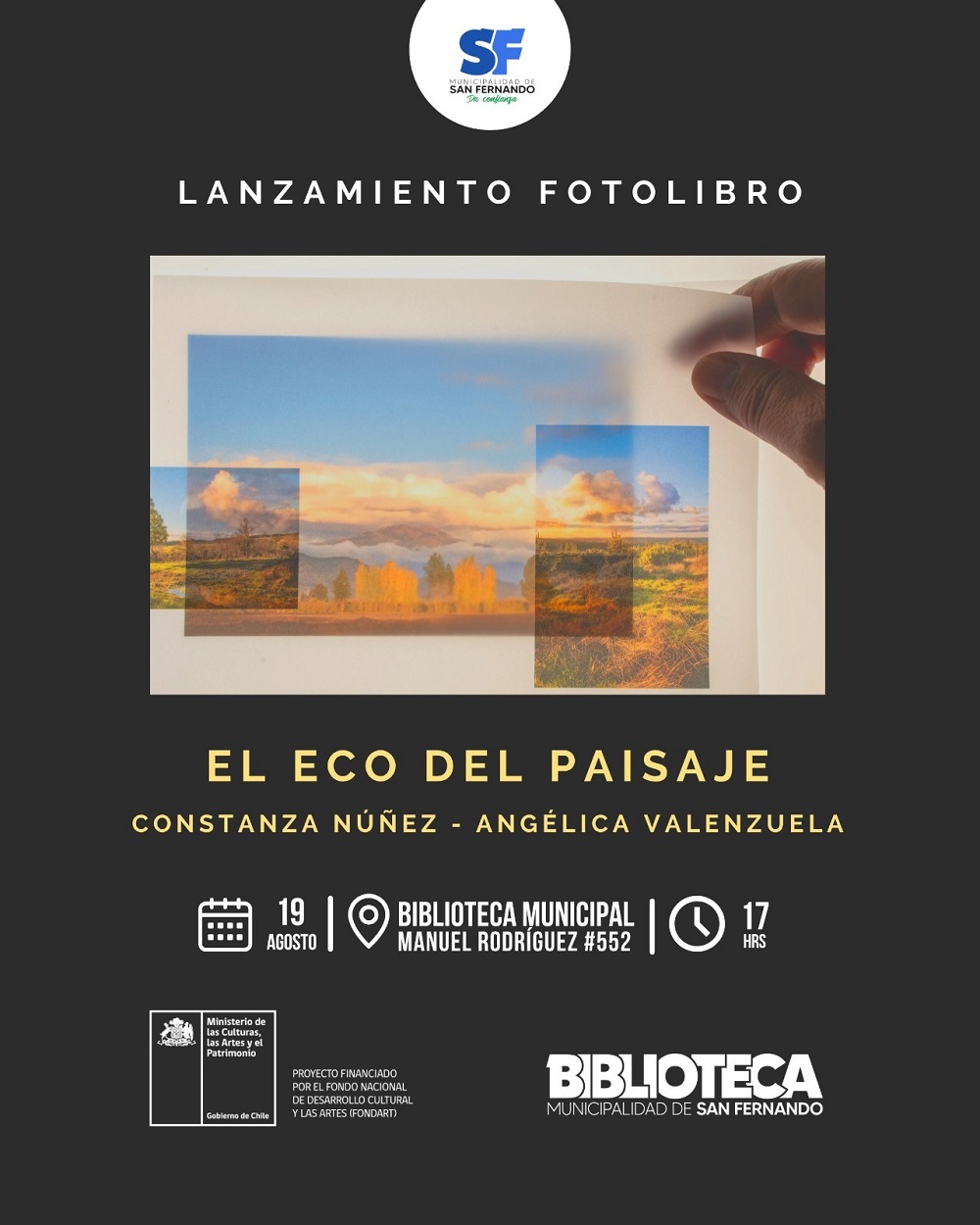 En el marco del Día de la Fotografía, este martes 19 de agosto, la artista y fotógrafa sanfernandina Constanza Núñez junto a Angélica Valenzuela, lanzará a las 17 horas en la Biblioteca Pública de San Fernando, el fotolibro “El eco del paisaje”, proyecto financiado por el Fondart Nacional de Creación 2024.