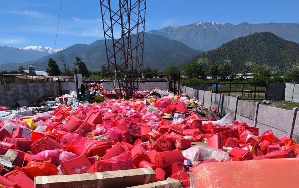 La pila de acopio alcanzaba unos 2 metros de altura. En el suelo, se encontraron numerosos elementos a libre exposición que constituyen un peligro inminente, tales como pilas, jeringas con agujas, y material quirúrgico (guantes, tijeras, cubetas, etc.), categorizados como residuos peligrosos y especiales, principalmente cortopunzantes.