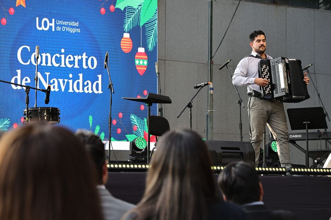En el frontis del Campus Rancagua, la Universidad de O’Higgins (UOH) congregó a familias, funcionarias/os, estudiantes y vecinas/os de la región en un Concierto de Navidad que llenó la noche de música, brillo y comunidad. La actividad, organizada por la Dirección de Cultura, Patrimonio y Extensión, ofreció una experiencia cargada de emoción, con presentaciones del campeón mundial de acordeón Joaquín Muñoz Donoso, el Coro UOH y el Coro Polifónico de Rancagua.