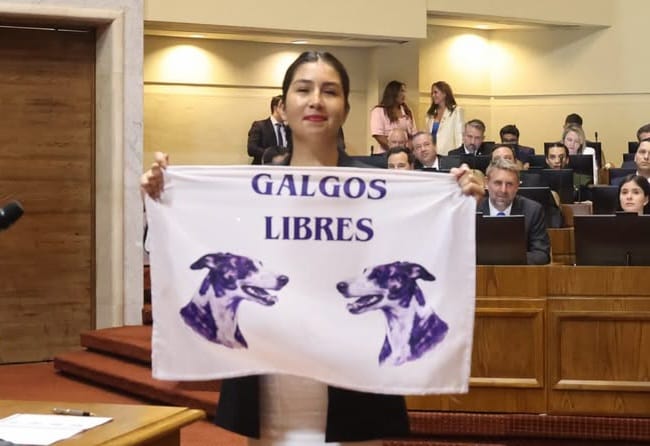 En ese sentido, enarbolando una bandera con la consigna “Galgos Libres”, hizo un llamado a todos los diputados y diputadas a avanzar con celeridad y aprobar el proyecto de ley que busca prohibir y sancionar las carreras de perros en Chile.